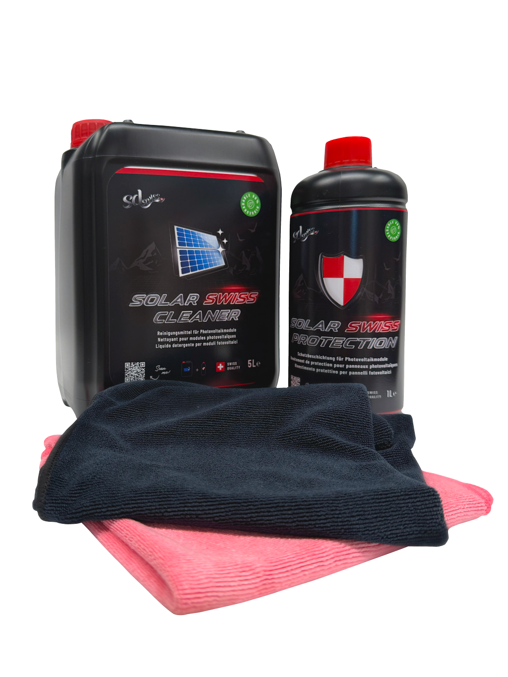 The panel surface must be clean and dry – use Solar Swiss Cleaner before application. Apply Solar Swiss Protection to a clean microfiber cloth or sponge applicator. Spread evenly across the entire PV module surface using crosswise motions. Leave to dry after application. For large installations, work in sections to maintain optimal control over the coating process.